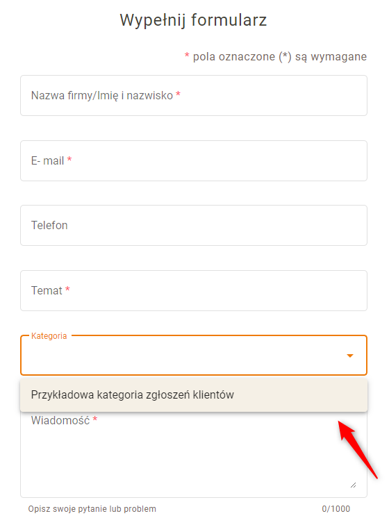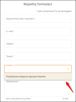3. Dodana kategoria będzie widoczna do wyboru w formularzu kontaktowym, w polu Kategoria.