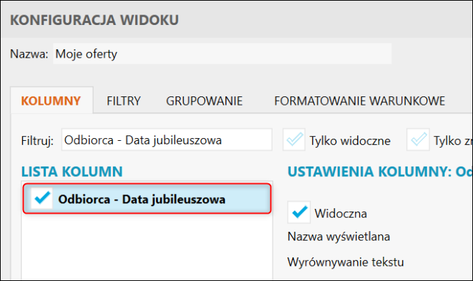 Gestor nexo – Jak do widoku Ofert dodać kolumnę Odbiorca – Data jubileuszowa?