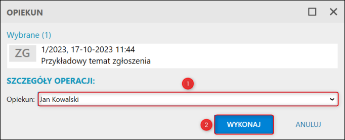 2. Wskazać odpowiednią osobę w polu Opiekun. Zatwierdzić przyciskiem Wykonaj.
