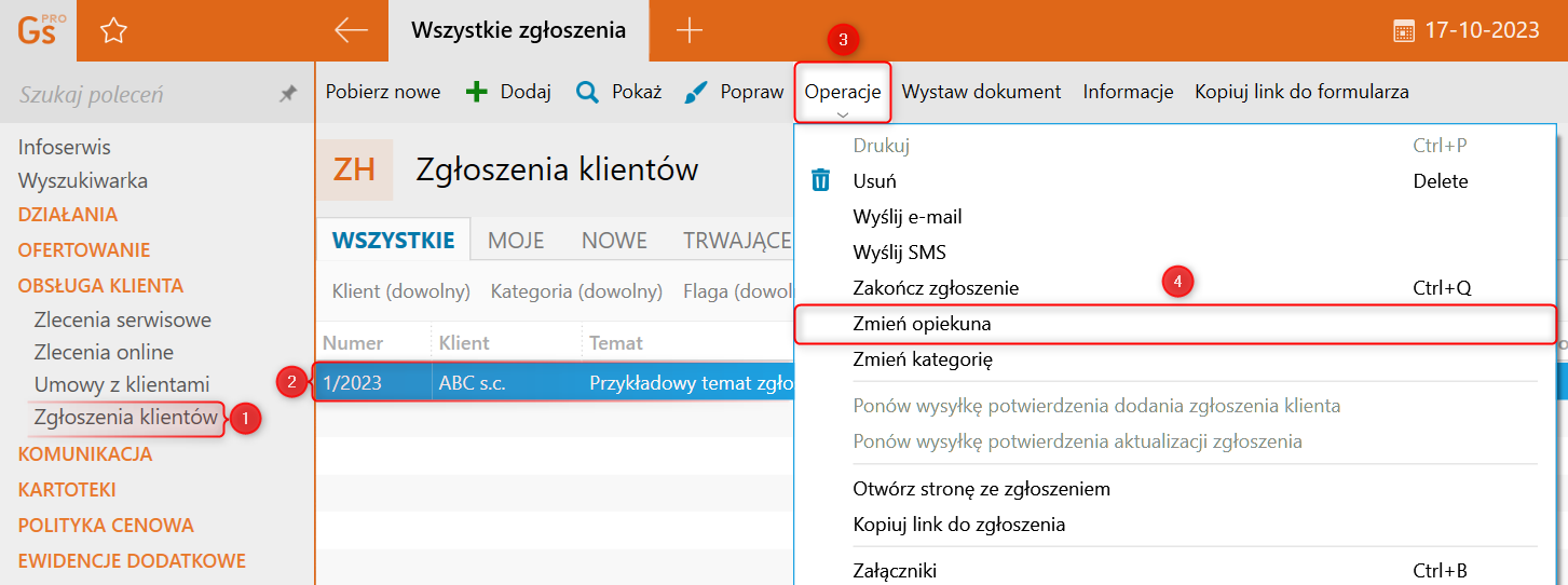 1. Przejść do modułu Zgłoszenia klientów, zaznaczyć pozycję na liście, a następnie wybrać Operacje – Zmień opiekuna​.