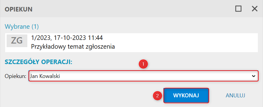 2. Wskazać odpowiednią osobę w polu Opiekun. Zatwierdzić przyciskiem Wykonaj.