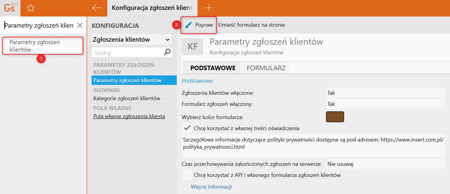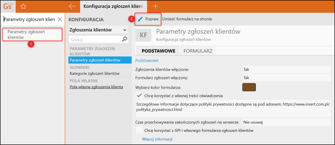 Aby edytować Parametry zgłoszeń klientów, należy przejść do Konfiguracji, odszukać i wybrać Parametry zgłoszeń klientów, a następnie kliknąć Popraw.