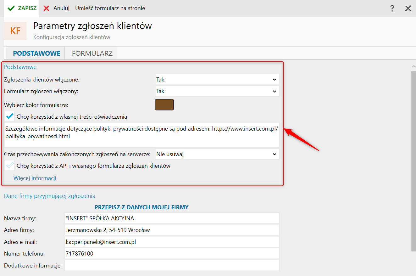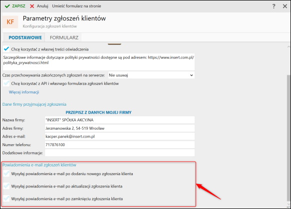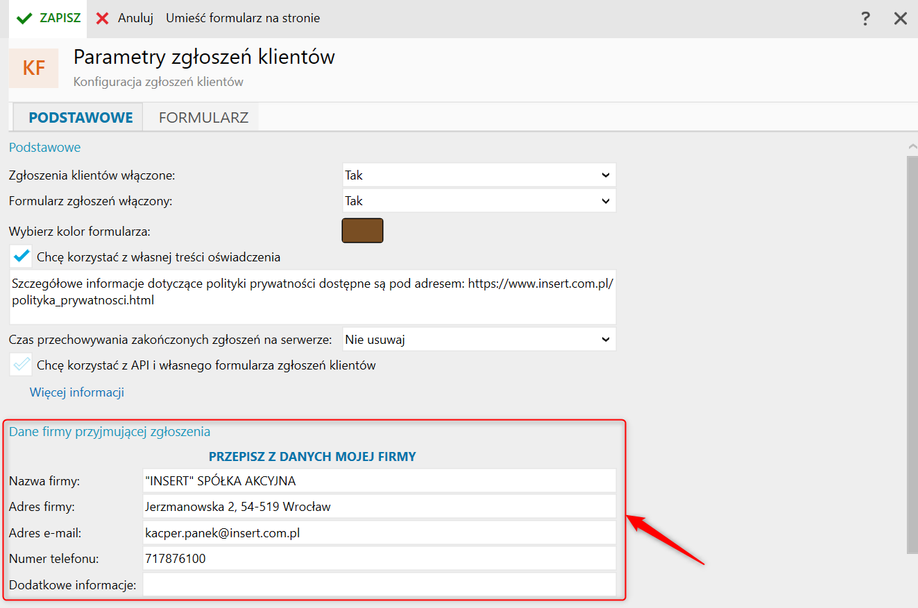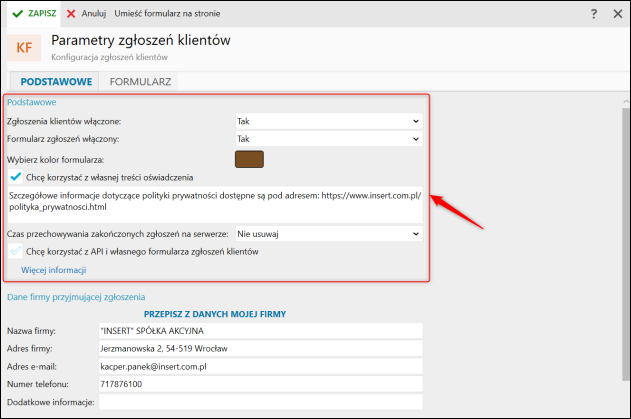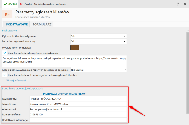 W sekcji Dane firmy przyjmującej zgłoszenia można określić dane firmy, które klienci zobaczą w formularzu zgłoszeniowym. Domyślnie podpowiadane są dane z kartoteki Moja firma.