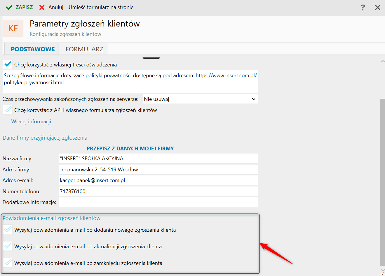 W sekcji Powiadomienia e-mail zgłoszeń klientów można określić, czy klienci mają otrzymywać potwierdzenia wysłanych zgłoszeń, powiadomienia o ich aktualizacji oraz o zamknięciu.
