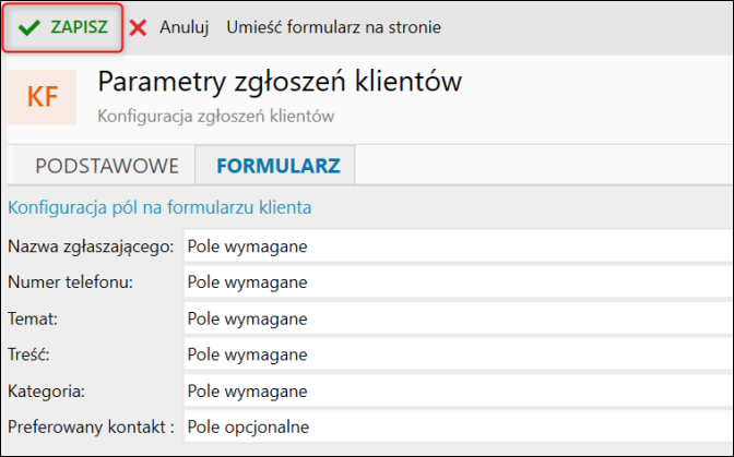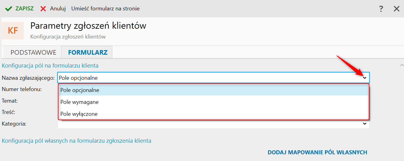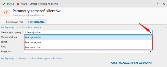 Na zakładce Formularz, w sekcji Konfiguracja pól na formularzu klienta, można ustawić dane pole jako opcjonalne, wymagane lub całkowicie wyłączone.