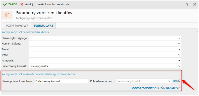W sekcji Konfiguracja pól własnych na formularzu zgłoszenia klienta można dodać własne pola do formularza zgłoszeniowego klienta. Więcej w tym temacie można przeczytać tutaj.