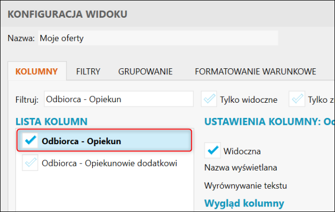 Gestor nexo – Jak do widoku Ofert dodać kolumnę Odbiorca – Opiekun?