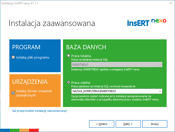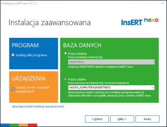 3. Jeśli serwer znajduje się w innym miejscu w obrębie jednej sieci, w sekcji BAZA DANYCH należy wskazać Pracę zdalną, a gdy SQL serwer zainstalowany jest lokalnie, trzeba wybrać Pracę lokalną. Dla pracy zdalnej trzeba wpisać adres serwera (NAZWA_KOMPUTERA\INSERTNEXO) lub – jeżeli sieć jest poprawnie skonfigurowana – można wybrać go z listy. Opis, w jaki sposób zweryfikować nazwę serwera SQL, można znaleźć w temacie e-Pomocy tutaj. Jeżeli wystąpią problemy z połączeniem, zalecamy, aby zapoznać się z tym artykułem.