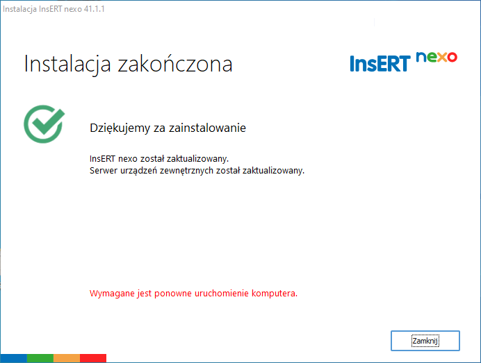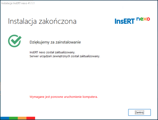 7. W ostatnim oknie należy kliknąć przycisk Zakończ oraz zrestartować komputer, jeżeli wyświetli się komunikat widoczny na poniższym zrzucie ekranu.
