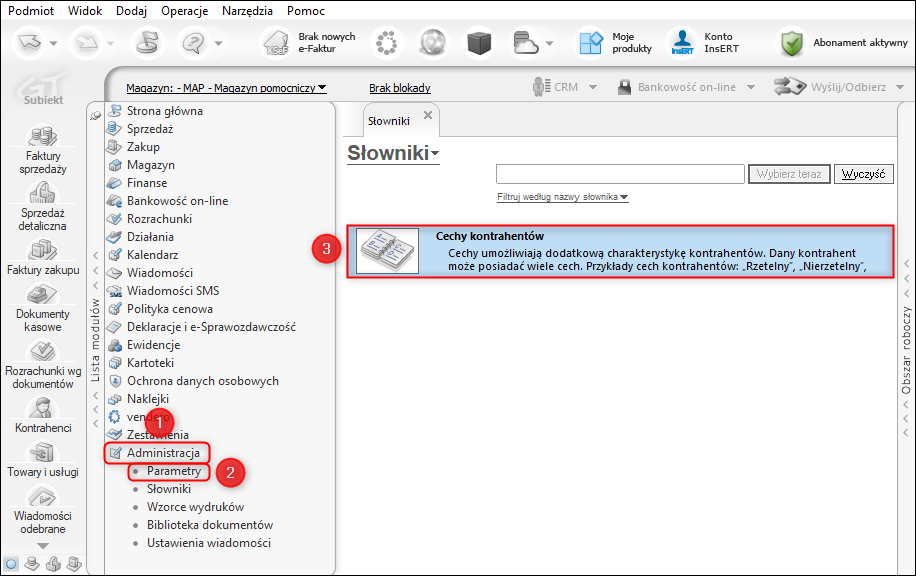 1. Z listy modułów wybrać Administracja – Słowniki, a z listy słowników Cechy kontrahentów.