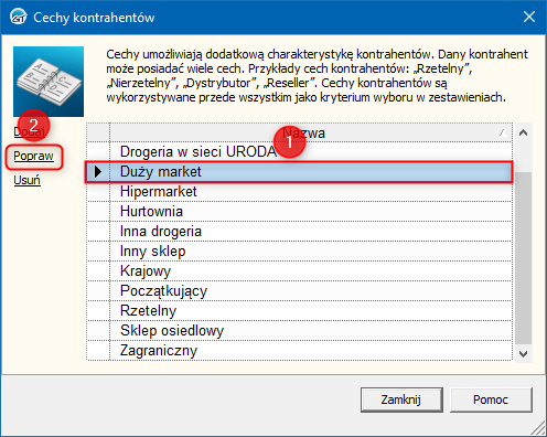 Cechy kontrahentów w programach linii InsERT GT umożliwiają dodatkową charakterystykę kontrahentów. Dany kontrahent może posiadać wiele cech. Cechy kontrahentów są wykorzystywane przede wszystkim jako kryterium wyboru w zestawieniach. W celu poprawy nazwy cechy kontrahentów, należy: