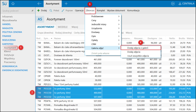 1. Przejść do modułu Kartoteki – Asortyment, zaznaczyć kartoteki asortymentu. Z górnego menu Zbiorczo wybrać Galeria zdjęć – Dodaj zdjęcia z galerii.