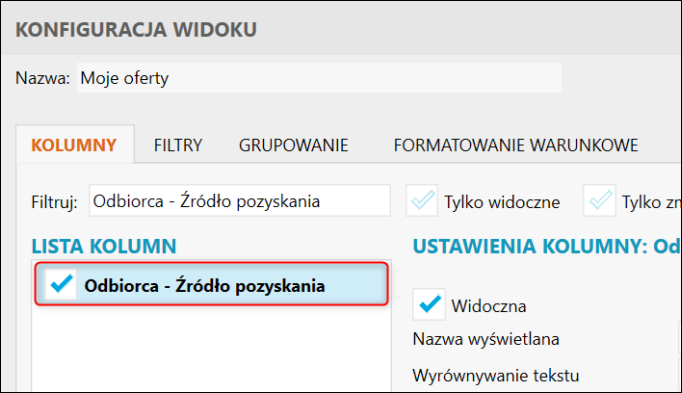 Gestor nexo – Jak do widoku Ofert dodać kolumnę Odbiorca – Źródło pozyskania?