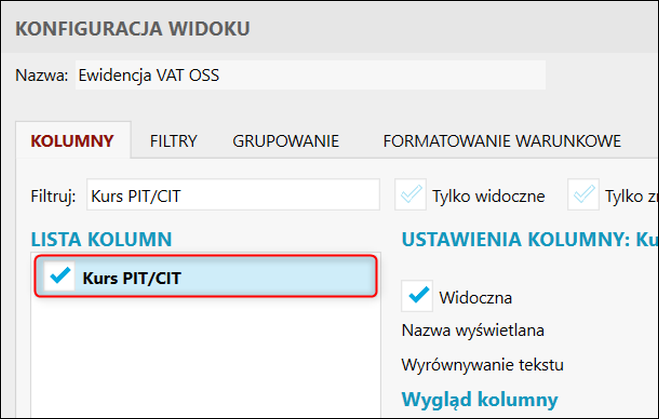 2. W polu Filtruj wpisać Kurs PIT/CIT, zaznaczyć wyszukaną kolumnę na liście poniżej i zatwierdzić przyciskiem OK.