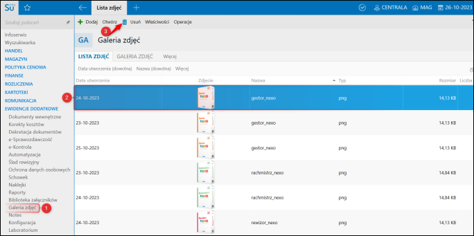 Moduł Galeria zdjęć służy do ewidencjonowania i zarządzania zdjęciami systemie nexo. Znajduje się w nim lista wszystkich zdjęć dodanych do systemu. Można je posortować według wybranych kryteriów, np. rozmiaru pliku. W module tym znajdują się także operacje pozwalające uporządkować galerię i scalić zduplikowane zdjęcia. Aby usunąć plik z Galerii zdjęć, należy: