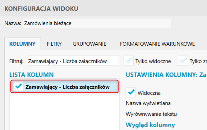 Aby pokazać kolumnę Zamawiający – Liczba załączników, należy: