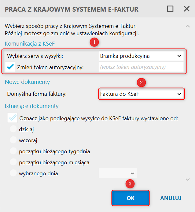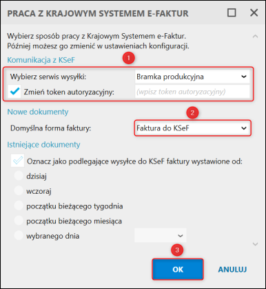 ​Po skonfigurowaniu KSeF w​ programie Pan Adam powinien wybrać sposób wysyłki dokumentów do KSeF.