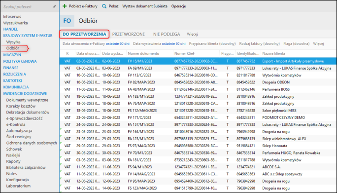 Wszelkie dokumenty, które zostały pobrane z systemu KSeF ręcznie lub automatycznie dostępne są w module Krajowy System e-Faktur – Odbiór w widoku Do przetworzenia. Aby zobaczyć podgląd e-Faktury, należy zaznaczyć odpowiedni dokument, następnie kliknąć Pokaż.