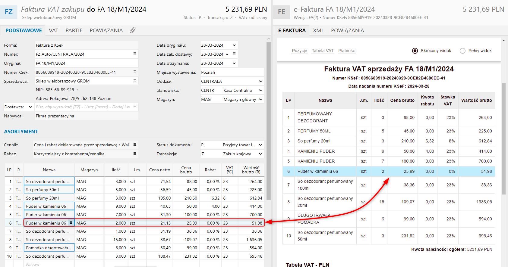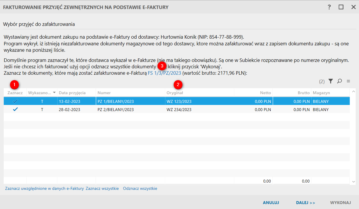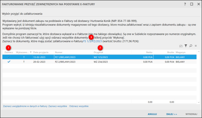 W przypadku gdy towar został przyjęty wcześniej np. poprzez dokument Przyjęcia zewnętrznego, system Subiekt nexo umożliwia zafakturowanie dokumentów magazynowych po odebraniu e-Faktury. Więcej informacji na ten temat znajduje się w artykule e-Pomocy technicznej​:
