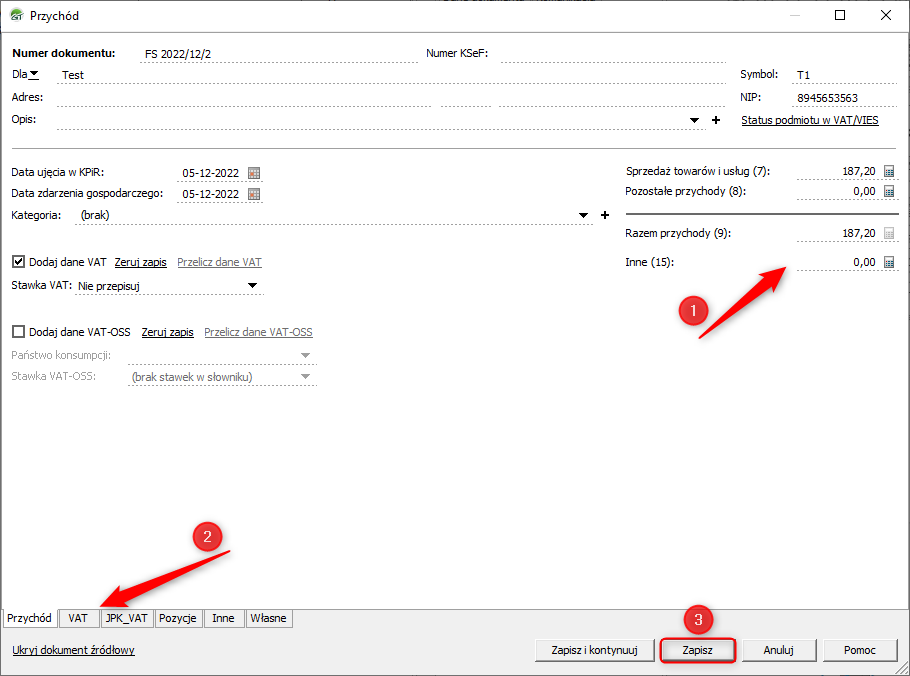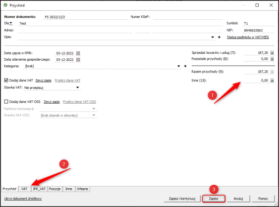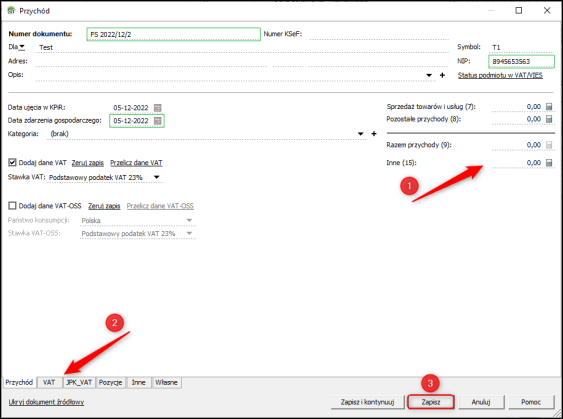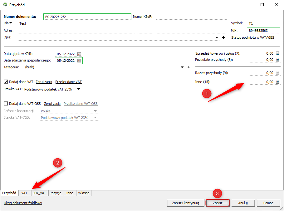 2. Wyświetli się okno dodawania wybranych zapisów. W lewym, dolnym rogu można przełączać się pomiędzy widokiem zapisu księgowego a zapisem w Ewidencji VAT. Po uzupełnieniu wszystkich niezbędnych danych zatwierdzić przyciskiem Zapisz.
