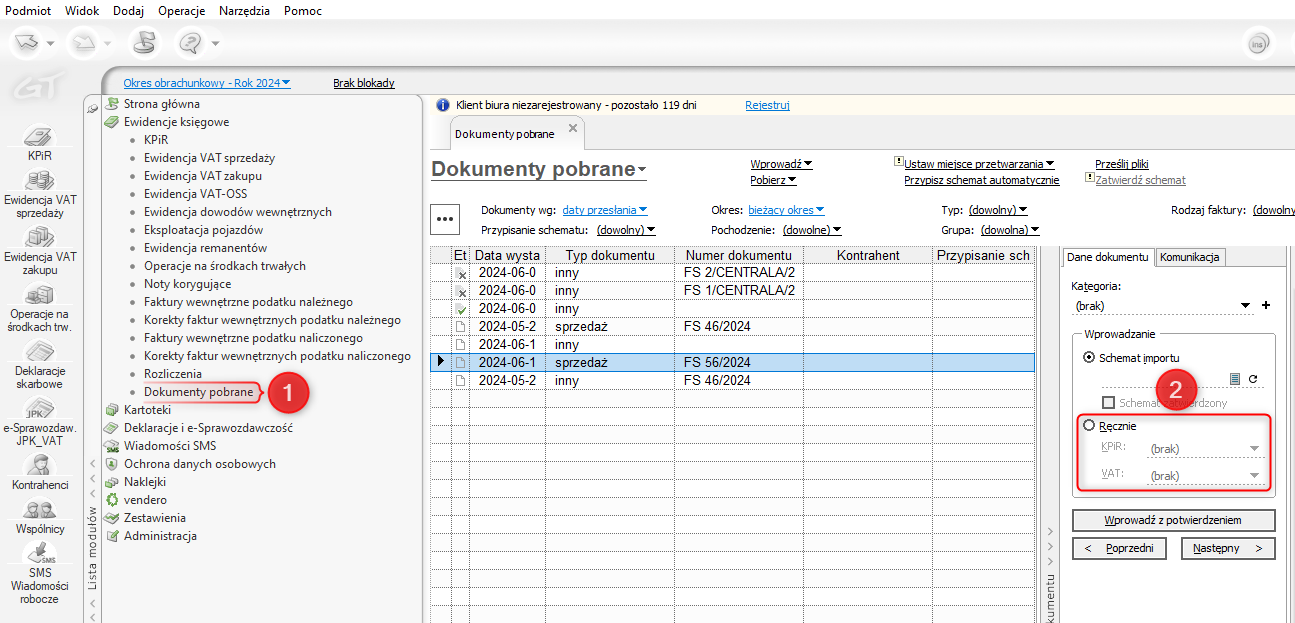 1. Przejść do modułu Dokumenty pobrane, zaznaczyć pozycję na liście, a następnie wskazać Wprowadzanie – Ręcznie. Po wskazaniu rodzaju zapisu księgowego i ewidencji VAT kliknąć Wprowadź z potwierdzeniem.