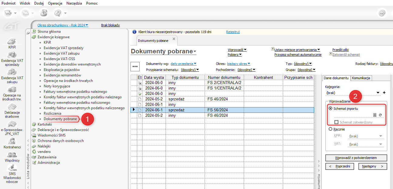 1. Przejść do modułu Dokumenty pobrane, zaznaczyć pozycję na liście, a następnie wskazać Wprowadzanie – Schemat importu. Po wskazaniu odpowiedniego schematu importu oznaczyć go jako Zatwierdzony i kliknąć Wprowadź z potwierdzeniem.