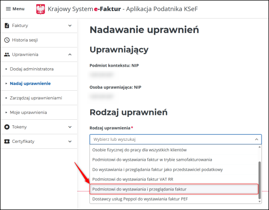 6. Wybrać rodzaj uprawnienia. W przypadku nadawania uprawnień dla biura rachunkowego odpowiednia będzie pozycja Podmiotowi do wystawiania i przeglądania faktur.
