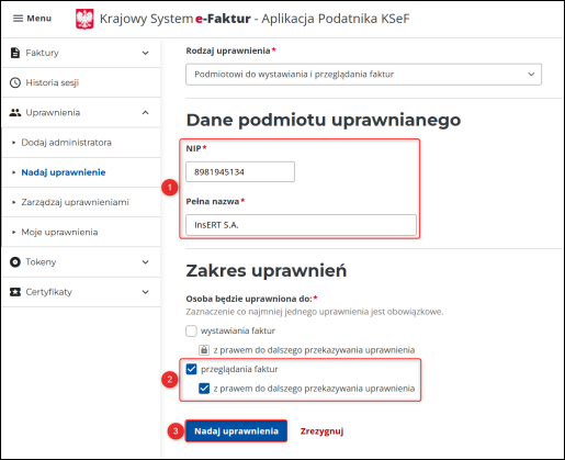 7. Nadać uprawnienie do przeglądania faktur. W przypadku, gdy biuro rachunkowe jest JDG lub posiada pieczęć firmową zaznaczanie opcji z prawem do dalszego przekazywania uprawnienia nie jest konieczne. Taka konieczność może natomiast pojawić się dla spółek, które nie posiadają pieczęci firmowej – wówczas zaznaczenie opcji spowoduje, że biuro będzie mogło nadać uprawnienia do przeglądania faktur w imieniu klienta wybranym pracownikom. Zatwierdzić przyciskiem Nadaj uprawnienia.