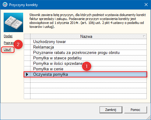 ​Słownik Przyczyny korekty w programie Subiekt GT zawiera listę przyczyn, dla których podmiot wystawia dokumenty korekt faktur sprzedaży i zakupu. Powiadanie przyczyn wystawienia korekty jest obowiązkowe  od 1 stycznia 2014r. (art. 106j ust. 2 pkt 4 ustawy o podatku od towarów i usług). W celu usunięcia przyczyny korekty należy: