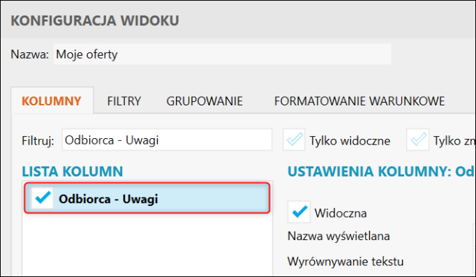 Gestor nexo – Jak do widoku Ofert dodać kolumnę Odbiorca – Uwagi?