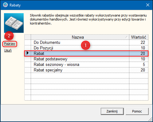 2. W oknie, które się wyświetli zaznaczyć rabat, którego nazwa ma zostać edytowana i kliknąć opcję Popraw.