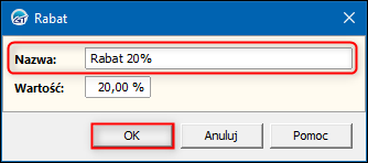 3. W oknie, które się wyświetli wprowadzić nową nazwę rabatu. Zmianę zapisać przyciskiem OK.