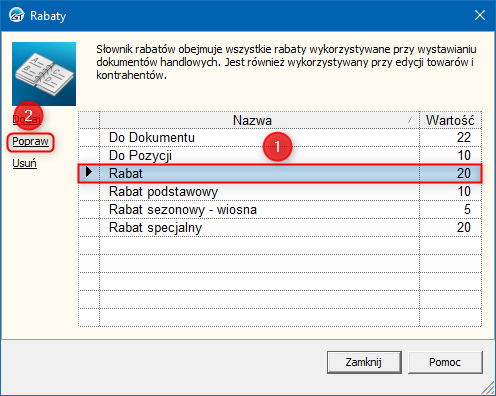 2. W oknie, które się wyświetli zaznaczyć rabat, którego nazwa ma zostać edytowana i kliknąć opcję Popraw.