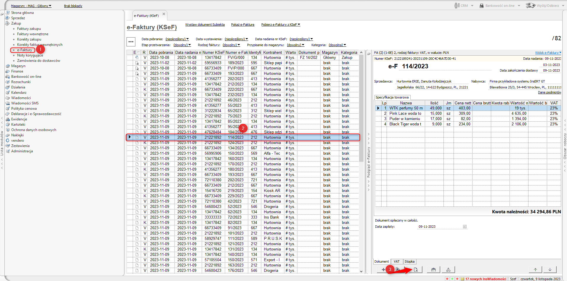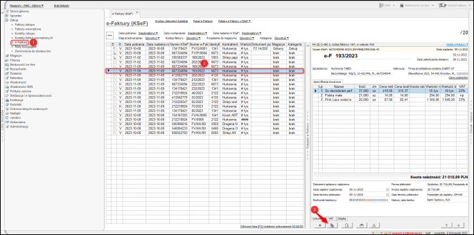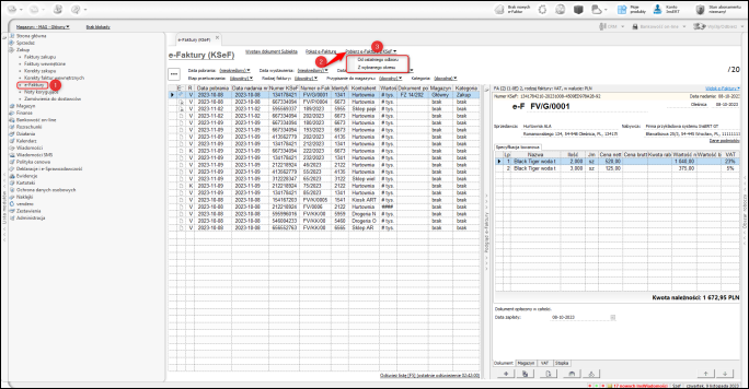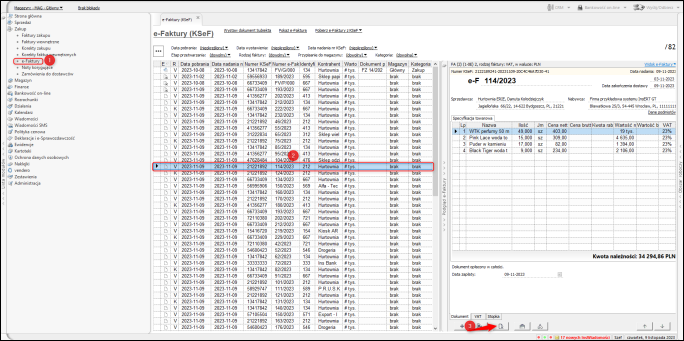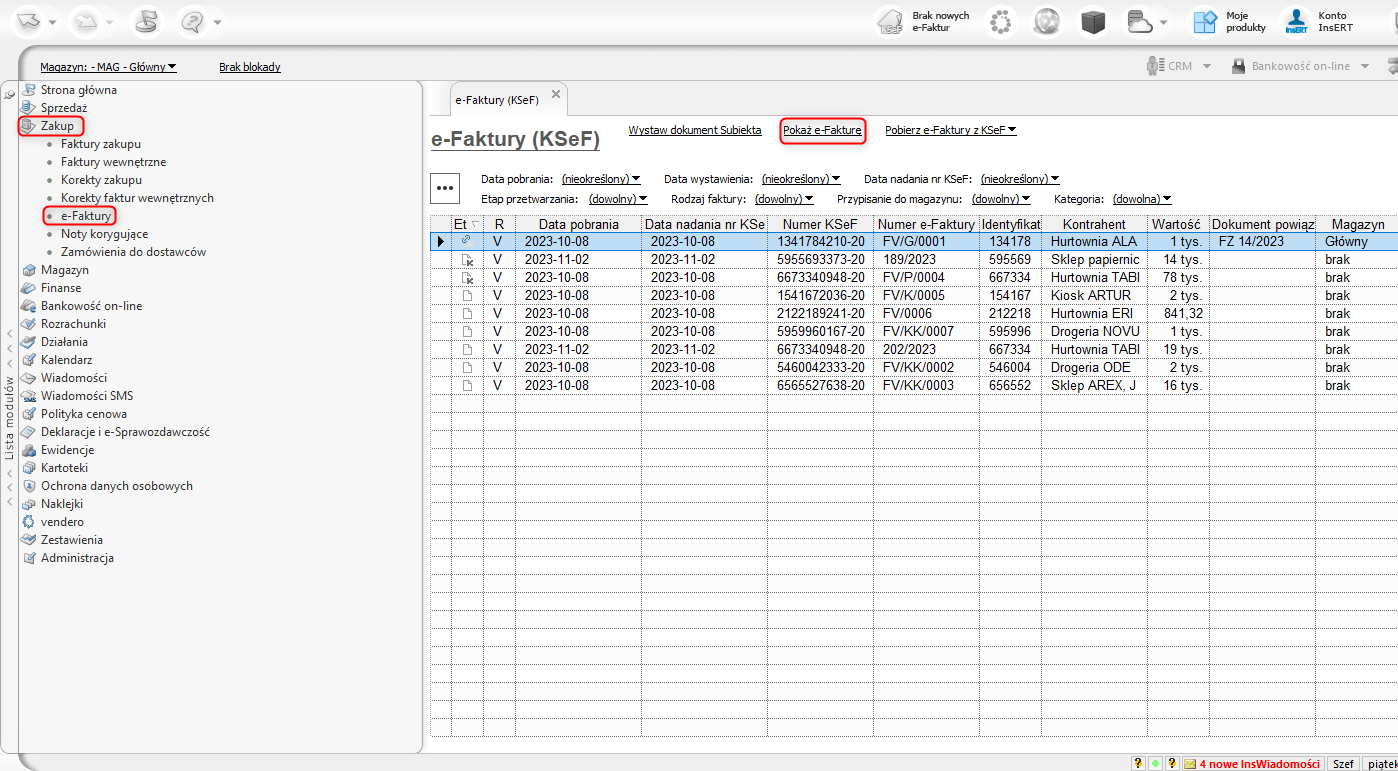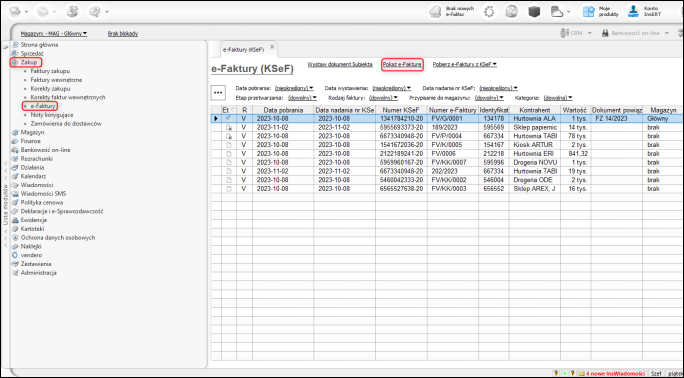 Wszelkie pobrane dokumenty, które zostały pobrane z systemu KSeF ręcznie lub automatycznie dostępne są w module Zakupe-Faktury (KSeF). Aby zobaczyć podgląd e-Faktury, należy zaznaczyć odpowiedni dokument, następnie kliknąć Pokaż e-Fakturę.