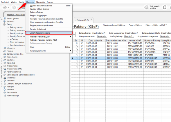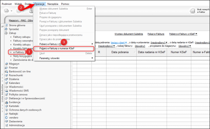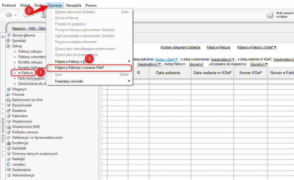 ​Dodatkowo program umożliwia pobranie e-Faktury na podstawie numeru KSeF. W tym celu należy przejść do modułu e-Faktury (KSeF). Z górnego menu kliknąć Operacje – Pobierz e-Fakturę o numerze KSeF.