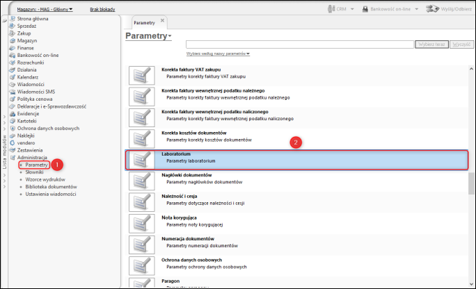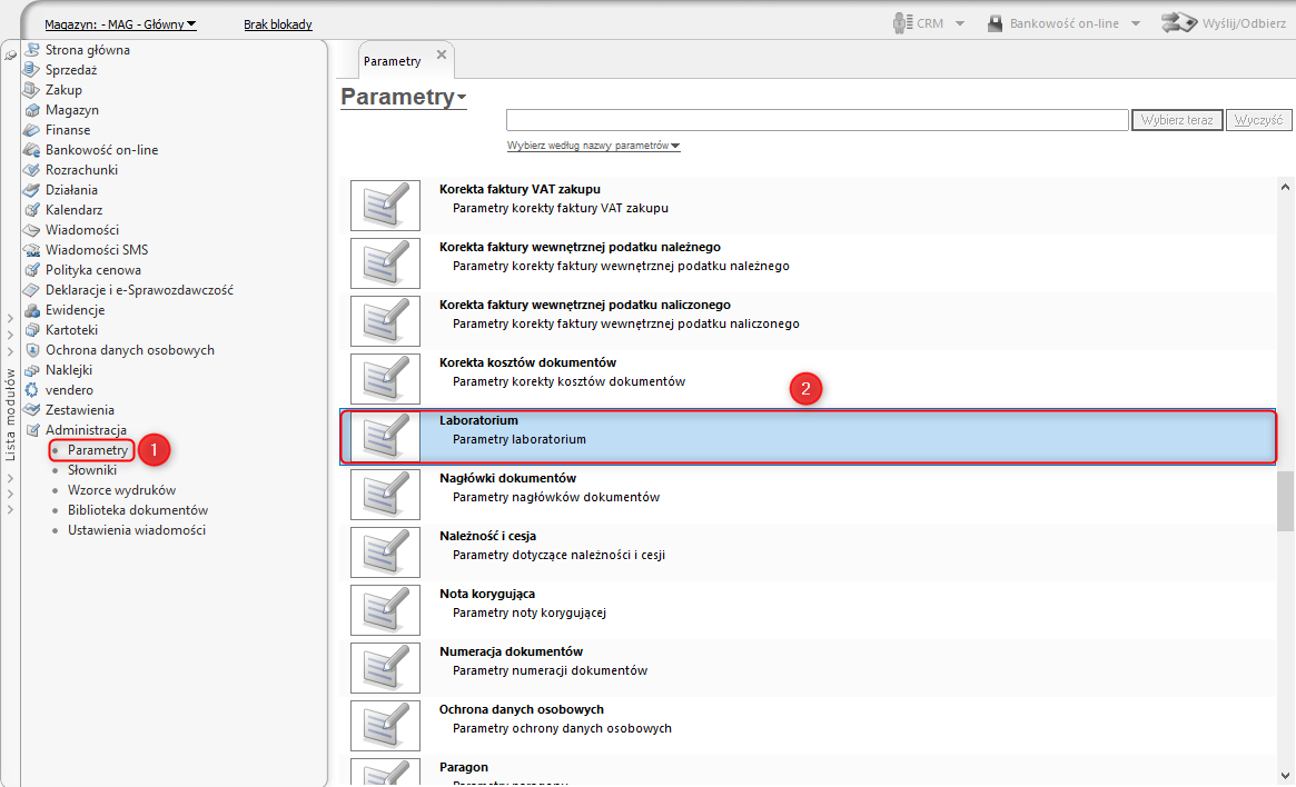 1. Uruchomić program następnie przejść do modułu AdministracjaParametry. Z listy wybrać Laboratorium.​​​