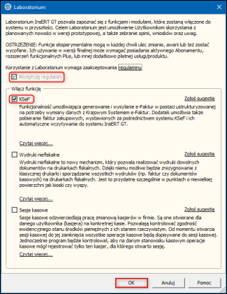 2. Zaakceptować regulamin Laboratorium. Włączyć funkcję KSeF. Kliknąć OK i uruchomić ponownie program