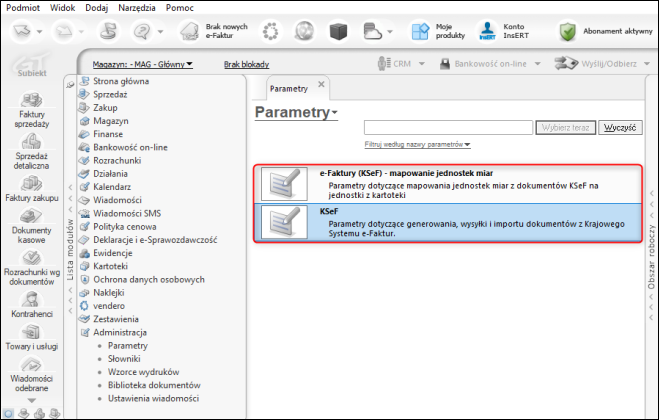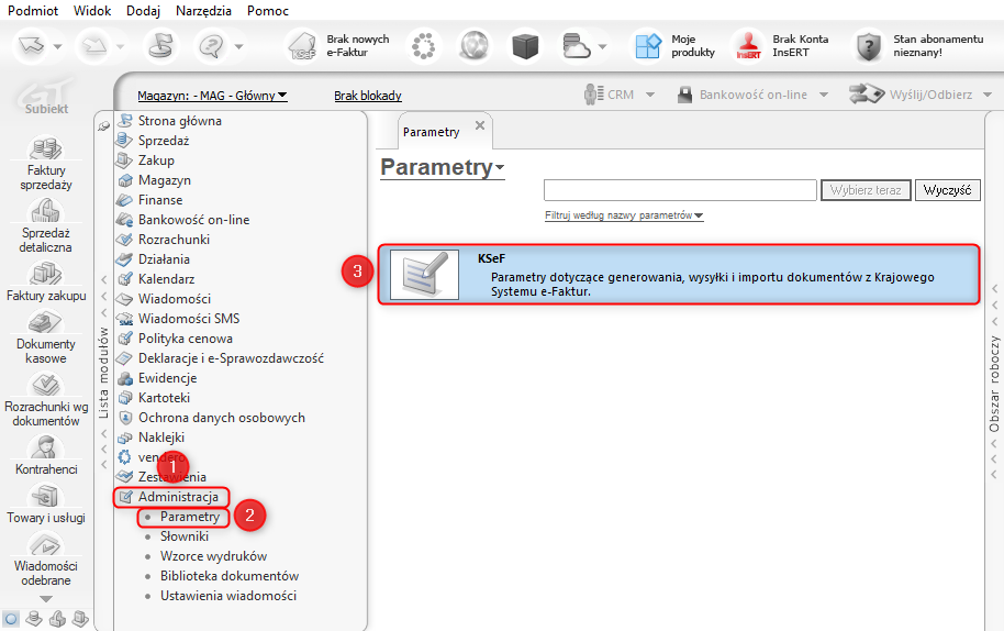 1. Przejść do modułu AdministracjaParametry, a następnie odnaleźć i uruchomić KSeF.