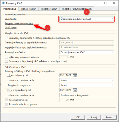 2. W sekcji Komunikacja on-line ustawić Wysyłaj doŚrodowisko produkcyjne KSeF, następnie kliknąć Przypisz token autoryzujący.