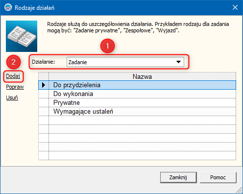 ​Rodzaje działań w programach InsERT GT służą do uszczegółowienia działania. Przykładem rodzaju działania dla zadania mogą być: "Zadanie prywatne", "Zespołowe", "Wyjazd". W celu dodania nowego rodzaju działania typu zadanie należy: