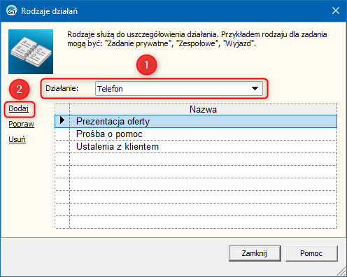 ​Rodzaje działań w programach InsERT GT służą do uszczegółowienia działania. Przykładem rodzaju działania dla zadania mogą być: "Zadanie prywatne", "Zespołowe", "Wyjazd". W celu dodania nowego rodzaju działania typu telefon należy: