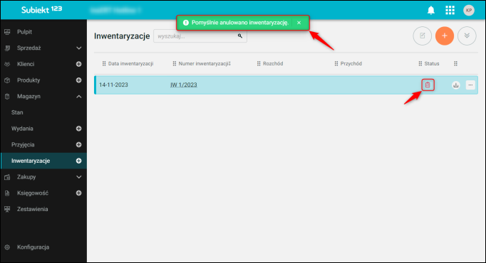 Subiekt 123 pozwala na dodanie inwentaryzacji, na podstawie której zaktualizowane zostaną stany magazynowe produktów. Skutek magazynowy zostaje wywołany dopiero po jej zatwierdzeniu. Aby anulować zatwierdzenie inwentaryzacji, a tym samym wycofać skutek magazynowy, należy: