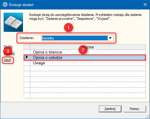 2. W oknie Rodzaje działań w polu Działanie wybrać Notatkazaznaczyć rodzaj, który ma zostać usunięty i kliknąć opcję Usuń.