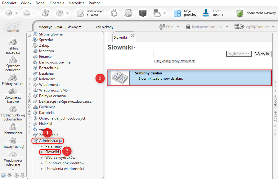 1. Z listy modułów wybrać Administracja – Słowniki, a z listy słowników Szablony działań.