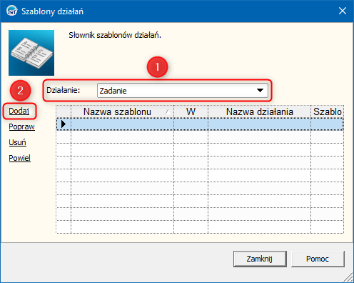 2. W oknie Szablony działań wybrać Zadanie w polu Działanie i kliknąć opcję Dodaj.
