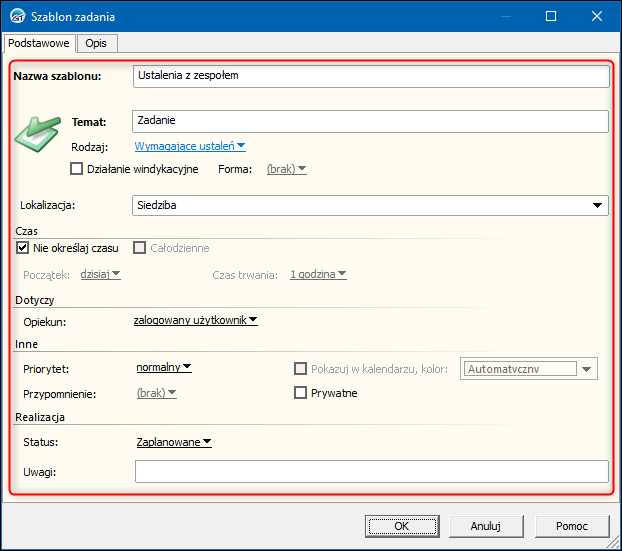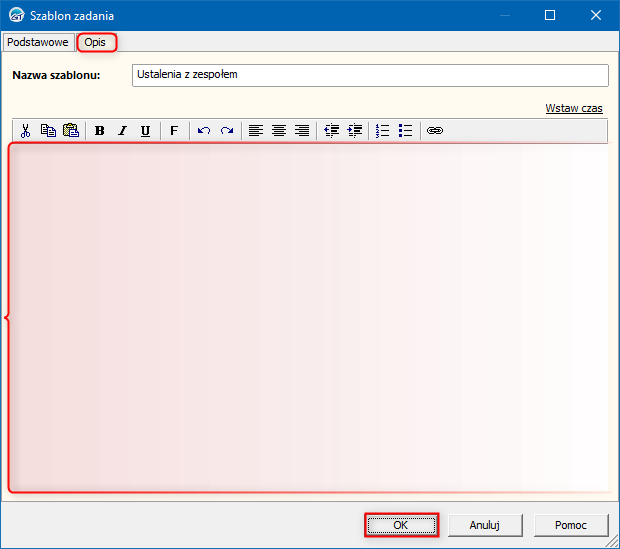 4. Na zakładce Opis można uzupełnić treść potrzebnymi informacjami. Szablon zapisać przyciskiem OK.