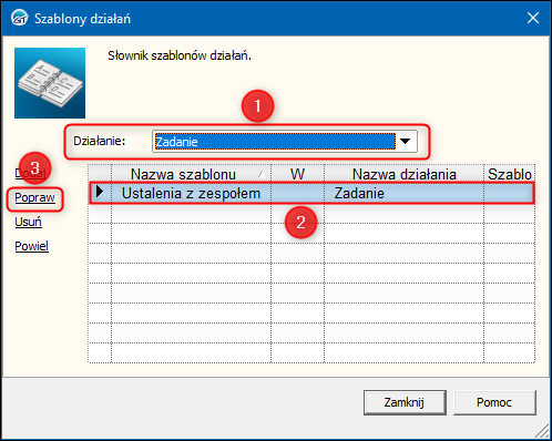 2. W oknie Szablony działań wybrać Zadanie w polu Działanie, zaznaczyć szablon, który ma zostać edytowany i kliknąć opcję Popraw.