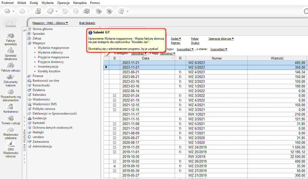 Rezultatem odebrania uprawnień będzie blokada możliwości realizacji wydań magazynowych fakturą zbiorczą potwierdzona odpowiednim komunikatem.