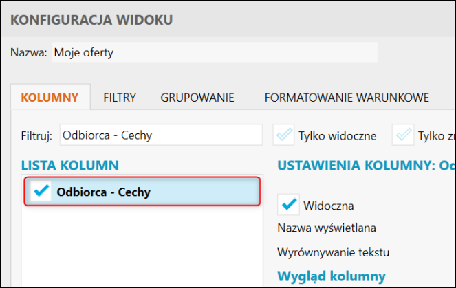 Gestor nexo – Jak do widoku Ofert dodać kolumnę Odbiorca – Cechy?