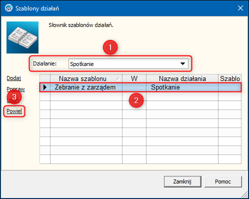 2. W oknie Szablony działań wybrać Spotkanie w polu Działanie, zaznaczyć szablon, który ma zostać powielony i kliknąć opcję Powiel.